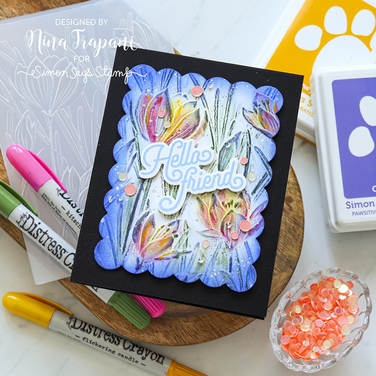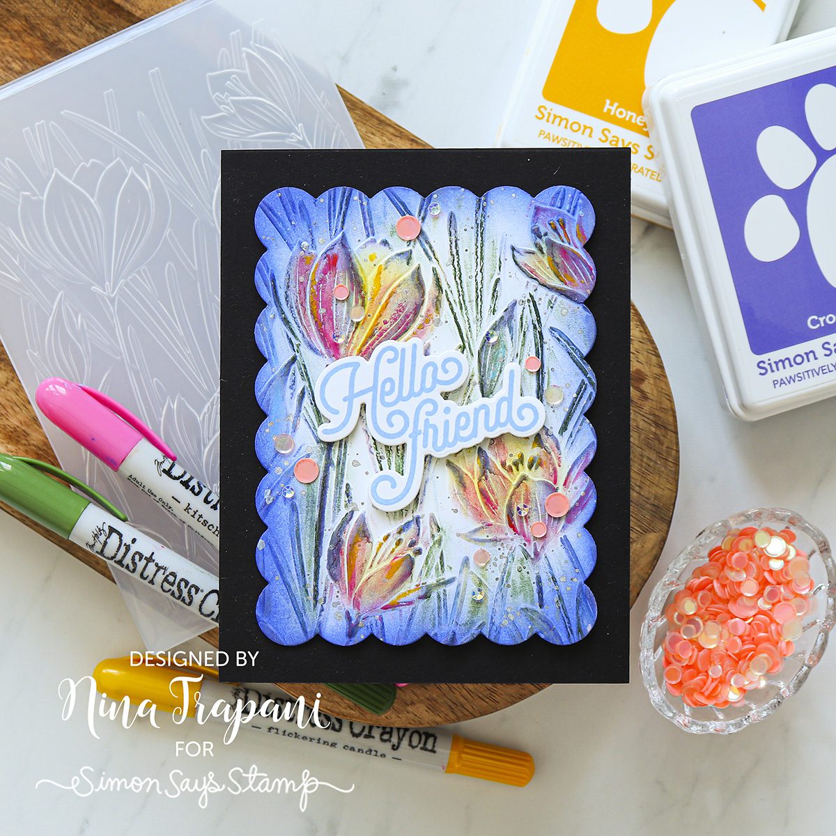 Do you like to play with mediums and layer them to create cool effects? If yes, then you’re going to have a blast with this idea! I’m using Tim Holtz Distress Crayons and Simon Says Stamp Pawsitively Saturated Inks on top of an embossed background, which provided a gorgeous mix of color and texture on my card! I’m also using new products from the Simon Says Stamp Beautiful Moments release—and participating in the blog hop celebrating this new collection!