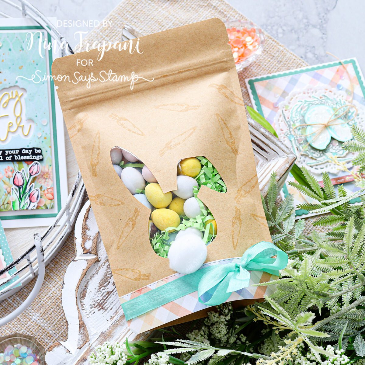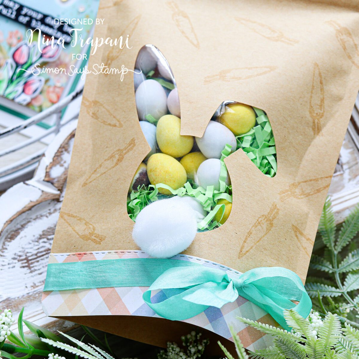 My bonus project using the Limited Edition Easter Kit is this darling bunny treat bag! You get two of these in the kit (and you can get more at the Simon Says Stamp store). I decorated mine with a little watermark stamping, added a strip of patterned paper and tied some of the ribbon from the kit around the bag. The extra-special touch is that adorable pom-pom tail! I love the see-through window because you can see the yummy treats inside!